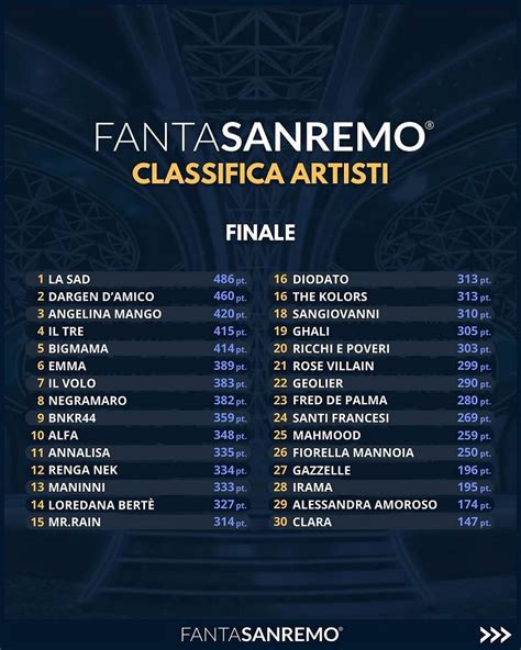 come funziona il nuovo gioco popolare ispirato al fantacalcio e perché gli artisti puntano agli eccessi e diventano trasgressivi. 👀 ricordati di seguirmi per altri video su sanremo @martinaamaschio _elebel__ 10h il festival di sanremo si guarda anche per fare punti al fantasaremo 😂 like reply view all 2 replies. What is fantasanremo. 🥹tizianoferrofantasaremosanremo2026 alessandra vanni and 687 others 688 36 last viewed on. Fantasanremo le regole, i bonus e quella frase da non dire mai, da olly a tony effe i capitani top tra novità e sorprese il gioco fantasy del festival conquista già un milione di squadre, Non farà punti al fantasaremo ma è bello il viva la cultura.